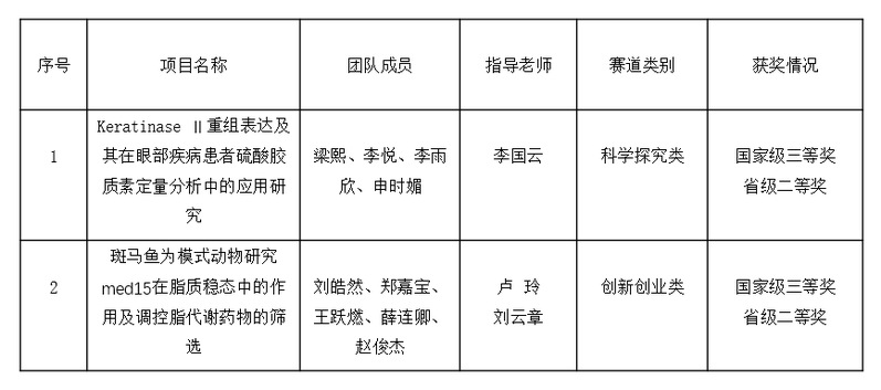 近日,第十届全国大学生生命科学竞赛决赛圆满落幕,医药学院李国云老师指导,2022级药学专业本科生梁熙负责的项目“Keratinase Ⅱ重组表达及其在眼部疾病患者硫酸胶质素定量分析中的应用研究”获得第十届全国生命科学竞赛(科学探究类)全国三等奖。医药学院卢玲与刘云章老师共同指导,2022级本科生刘皓然负责的项目“斑马鱼为模式动物研究med15在脂质稳态中的作用及调控脂代谢药物的筛选”获得第十届生命科学竞赛(创新创业类)全国三等奖。这是我院自赛事创办以来首次参加科学探究类竞赛并斩获佳绩,实现“零的突破”。