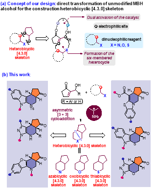 杂双环[4.3.0]骨架(氮杂、氧杂、硫杂)广泛存在于天然产物及具有重要药用价值的分子中(图1)。在现有的杂双环[4.3.0]骨架合成策略中,手性中心通常在反应早期引入,且需要多步官能团转化反应,步骤冗长。通过一步反应实现该核心结构的不对称催化合成策略目前仍处于探索阶段。当前,由于底物限制及方法学瓶颈,仅能构建单一类型的氮杂、氧杂或硫杂双环[4.3.0]骨架。因此,亟需建立一种可实现所有类型杂双环[4.3.0]骨架不对称催化合成的通用策略。