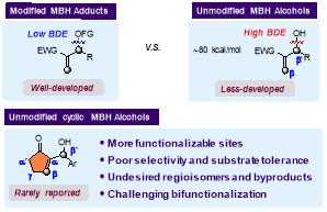 Morita-Baylis-Hillman(MBH)加合物(包括MBH碳酸酯、乙酸酯、卤化物及其他衍生物)可参与多种取代反应和环化反应。然而,与之形成鲜明对比的是,非修饰MBH醇虽原料廉价、原子经济性高,但直接使用非修饰MBH醇进行转化的反应却鲜有报道。核心原因在于C–OH键解离能高,羟基的离去能力较弱。苛刻的反应条件往往会导致反应选择性降低,进而生成各种副产物。非修饰MBH醇中C–OH键解离能高键的键解离能(BDE)约为80 kcal/mol,而MBH卤化物中C–Br键的键解离能仅约为57 kcal/mol(图2)。非修饰MBH醇的高键解离能导致其应用开发存在很大挑战,尤其是环状非修饰MBH醇存在多个反应位点,区域与立体选择性控制极具挑战。