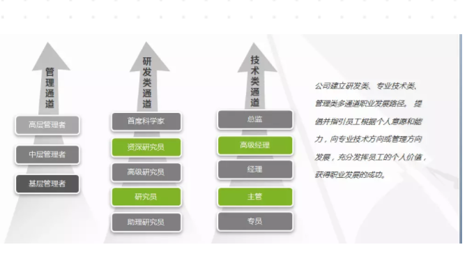 公司建立专业技术类、管理类双通道职业发展路径,提倡并指引员工根据个意愿和能力,向专业技术方向或管理方向发展,充分发挥员工的个人价值,获得职业发展的成功。![]()