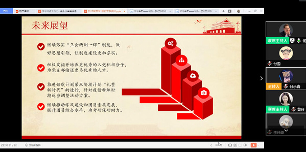 本站讯 4月4日晚,医药学院2017级药学第一团支部“团员教育评议大会暨习近平总书记重要讲话团课学习”大会线上会议顺利召开。班主任李国云老师、2017级药学第一团支部全体团员参加本次会议,团支部书记何悦主持此次会议。