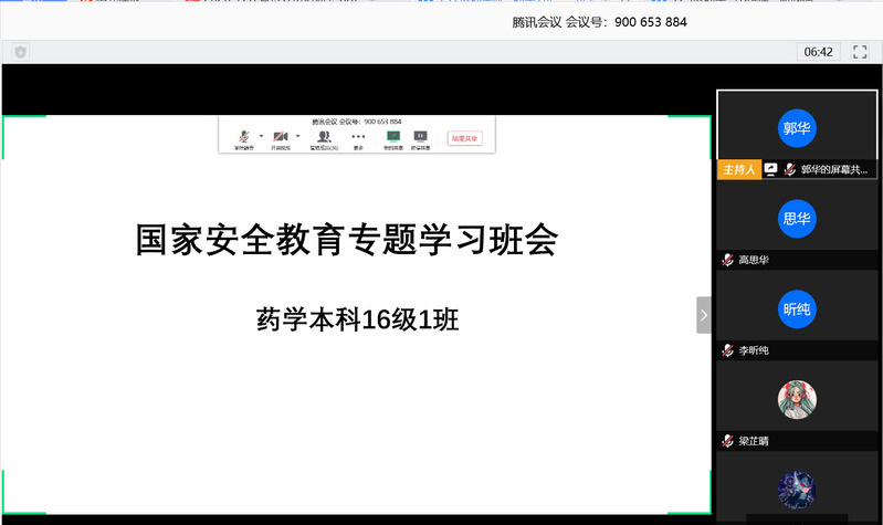 本站讯4月17日上午,医药学院2016级药学1班“国家安全教育专题学习班会”于线上召开。2016级药学1班共45位班级成员参与本次班会,班会由班长郭华主持。