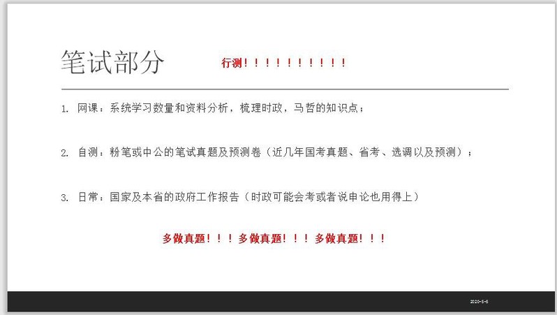 紧接着,米丽媛向同学们介绍了自己的笔试备考经验及学习方法,包括行测和申论两方面。行测方面,米丽媛主要通过网课进行系统学习,然后通过笔试真题及预测卷进行自测。申论方面,米丽媛建议了解所有公文格式,多练习多总结。