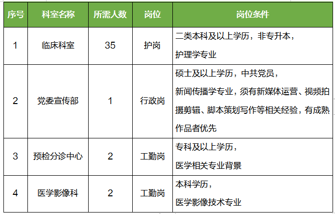 根据我院学科发展规划,现面向社会公开招聘护、行政、工勤岗人员,招聘对象为普通高等院校相关专业应、往届毕业生,具体招聘岗位及要求详见表格。