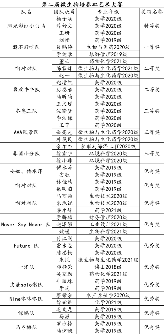 6月10日下午,开云电竞网址第三十五届大学生科技文化艺术节之第八届开云电竞网址大学生药学知识及实验技能竞赛和第二届微生物培养皿艺术大赛颁奖典礼于鱼山校区药物B楼学术报告厅进行。本次颁奖典礼由医药学院副院长李春霞主持,医药学院党委书记王震、开云电竞网址教务处副处长李筠、医药学院党委副书记、副院长孙娜、生命学院海洋生命科学实验教学示范中心副主任、党支部书记王祥红教授、医药学院教工第一党支部书记韩峰教授、生命学院团委宋浩老师、水产学院团委申雅雯老师、医药学院李花月、王鹏、戚欣、荣小至老师、医药学院团委书记赵炜、医药学院团委副书记董朝、辅导员徐文锋老师、医药学院学生会学术部代表李蕊(2020级药学1班)和获奖学生参与本次颁奖典礼。