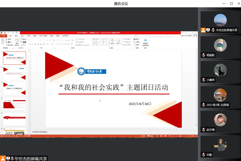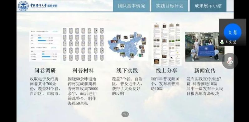 激实践热情,会初心使命。医药学院团委鼓励各支部在线上搭建暑期实践活动报告及实践成果展示平台。2020级本科生团支部、2021级本科生团支部等邀请团员代表对“科普深蓝,向海问药”“黄河流域医药知识宣传”等多个主题进行分享,激发同学们投身社会实践的热情,感悟时代新人的初心使命,扎实推进主题团日活动。