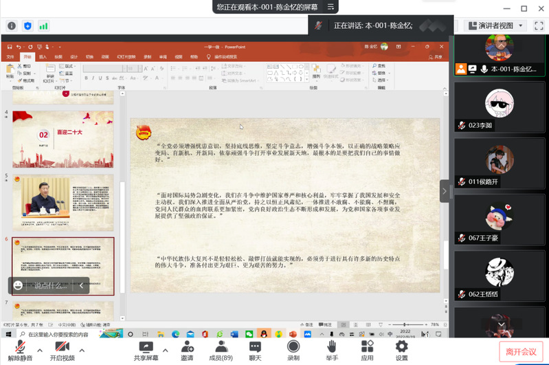 学时事讲话,悟时代精神。医药学院团委动员各团支部以学习习近平总书记在省部级主要领导干部“学习习近平总书记重要讲话精神,迎接党的二十大”专题研讨班上发表的重要讲话、学习习近平总书记在庆祝香港回归祖国25周年大会暨香港特别行政区第六届政府就职典礼上的讲话为理论指引,教育指导广大团员青年坚定理想信念、发扬艰苦奋斗的精神,明确方向、爱国爱党,争做担任民族复兴的时代新人。