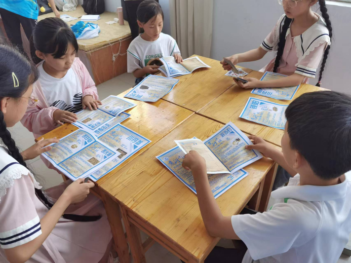 实践团成员首先给每个孩子发放了黄河流域医药知识宣传海报和手册,依据海报和手册内容向孩子们讲解了与中药有关的基本知识以及黄河流域几种常见中药材的产地、性状、主治功能等知识,着重展示了阿胶、川丹参、冬虫夏草等大家耳熟能详的药材。同学们仔细阅读了海报及手册上的图文内容,认真聆听讲解,积极地参与互动。讲解完毕,同学们主动热情地参与了相关调查问卷的填写。最后,实践团成员给每位同学都发放了精美的中药明信片作为纪念。