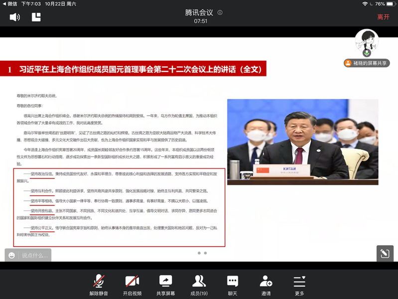各团支部认真学习了习近平总书记在各会议上的重要讲话及在各媒体上发表的署名文章,体会“把握时代潮流,加强团结合作,共创美好未来”的主题及中国为人类命运共同体发展做出的贡献,激发团员青年们的爱国热情与担当;学习总书记给中国国际服务贸易交易会等组织所致贺信,体会中国愿意同各方一道为解决国际性问题而努力的决心;学习共青团中央书记处专题学习《习近平谈治国理政》的会议内容,了解团中央书记处对于各级团组织提出的工作要求,为加强支部建设作出努力。