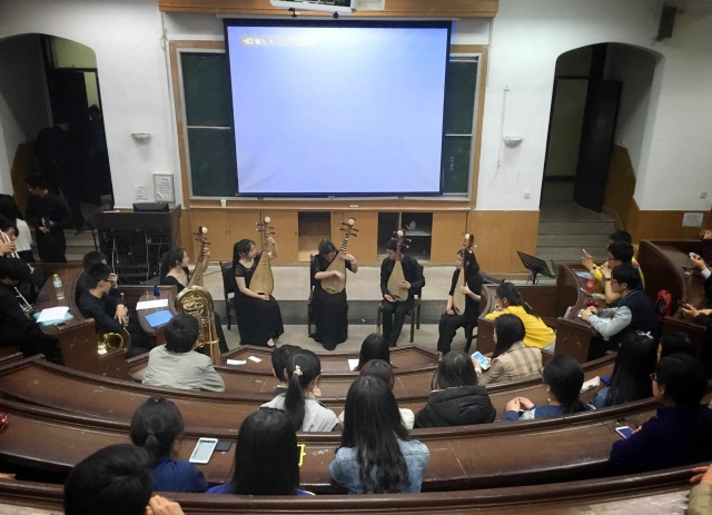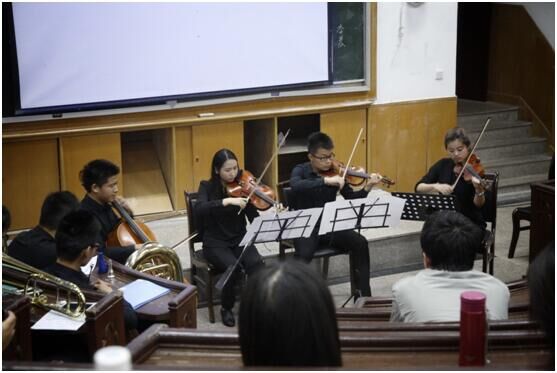 此次活动同前几次的艺术实践活动一样,由美妙的音乐旋律为我们拉开表演序幕。演出曲目由西方音乐和民族音乐两部分组成,例如《莫扎特弦乐四重奏op.525》、《baby elephant walk》、《冬猎》、《二胡随想曲第三号——弦动》等。每一首乐曲的表演都生动活泼,参与演出的同学们声情并茂,全情投入,将他们为此次演出所付出的辛勤努力都化作此次表演的动力,把自己的技能尽情的展现出来。同时,此次演出的乐器也是多种多样,如西洋乐器,萨克斯,长笛,铜管,也有民族乐器,扬琴,笙,二胡,琵琶等。表演部分结束后又到了活动的另一个小高潮——乐器讲解部分。艺术系的同学们生动的为大家讲解了每一件乐器的特性,准确的阐述了每一首作品所表达的音乐意境和情感,并与生命学院师生们进行互动,热情的回答大家的提问。观众们认真地聆听每一首作品,欣赏并感受音乐的无穷魅力。