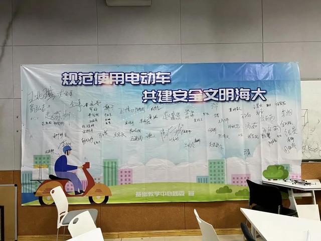 会议结束后,同学们现场签署《安全使用电动车承诺书》,并在“规范使用电动车,共建安全文明海大”签名墙上签字。