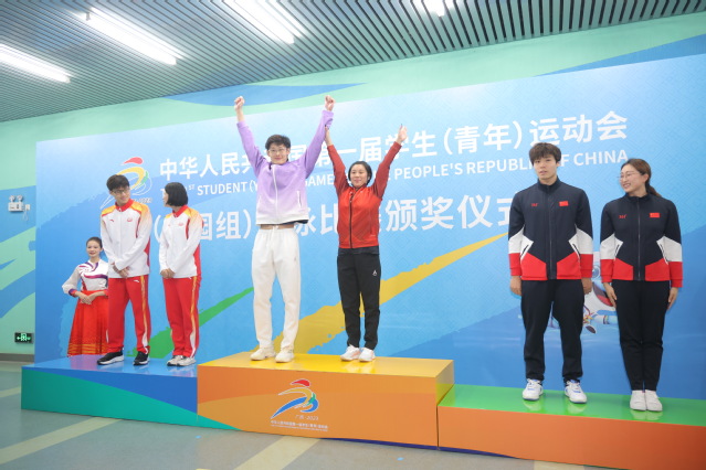 徐放同学(中)获男子大学乙组100米蝶泳项目金牌