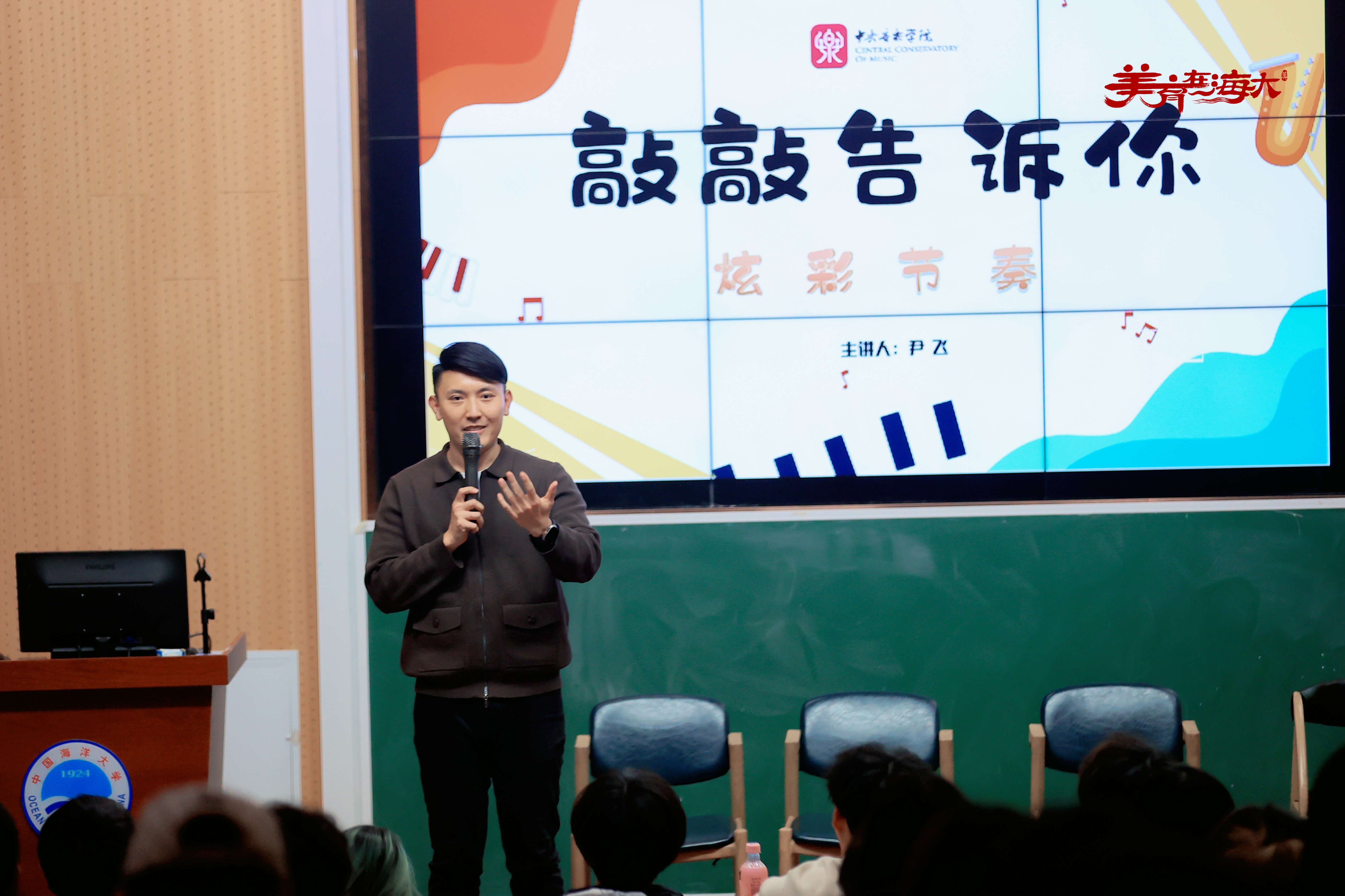 本次讲堂以“敲敲告诉你·炫彩节奏”为主题,由基础教学中心艺术系副主任宁燕主持,中央音乐学院青年教师尹飞主讲,基础教学中心副书记王静、校团委副书记李文庆、校团委宣传部部长王晓鹏出席。尹飞从“什么是节奏”、“测试你的节奏感”、“速度、节拍、基本节奏型”、“中国打击乐——京剧锣鼓”、“趣味打击乐——身体打击乐”等五个部分为到场师生演绎了一场别开生面的音乐盛宴,讲授了节奏在打击乐中的重要意义,引导大家切身感受音乐中的节奏。