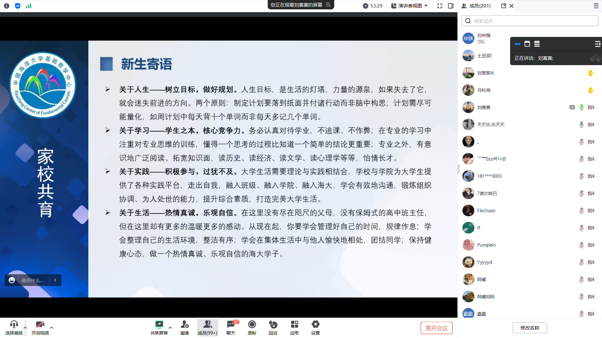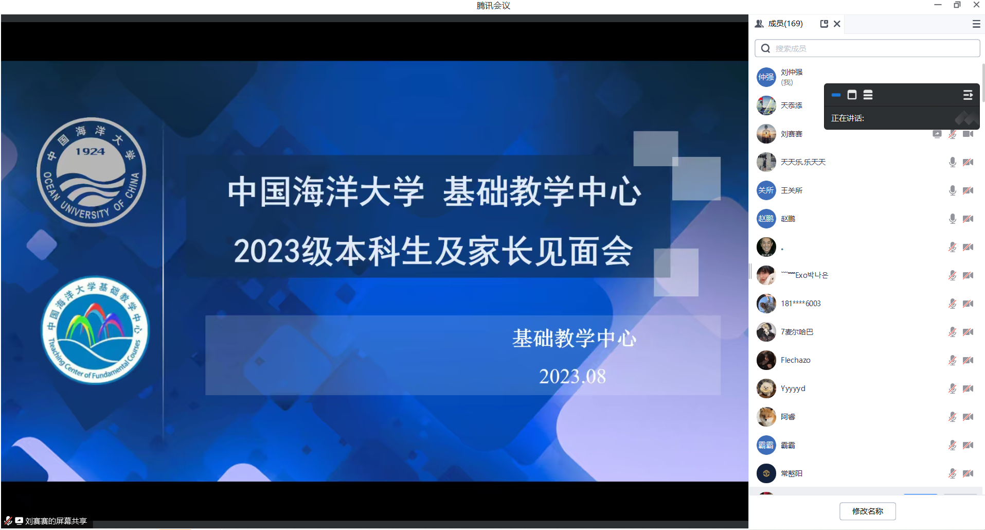 8月23日晚,基础教学中心(以下简称中心)2023级本科新生线上家长会顺利举办。会议由中心党委副书记王静主持,中心团委全体辅导员、全体2023级本科新生及部分家长共同参会。