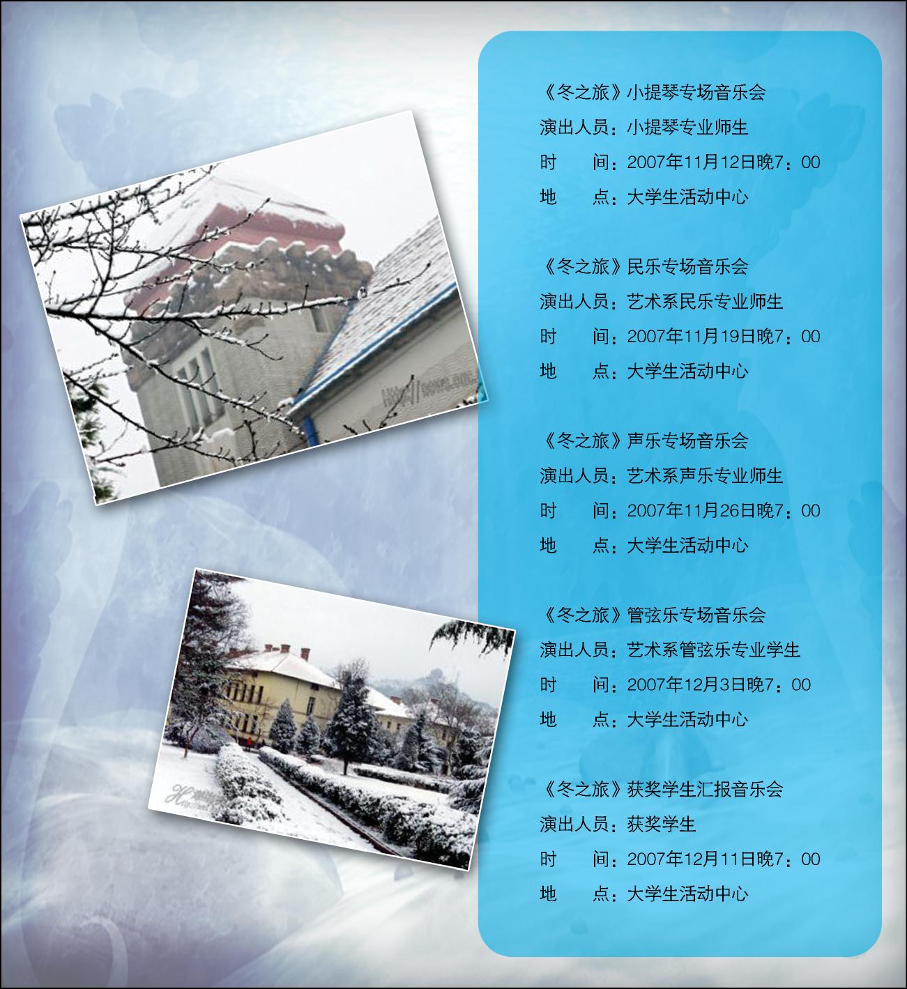 本次音乐演出季主要内容包括:《欢乐金秋》系列音乐会、《开云电竞网址艺术系教师专场音乐会》、《冬之旅》系列音乐会及《开云电竞网址新年音乐会 》等。