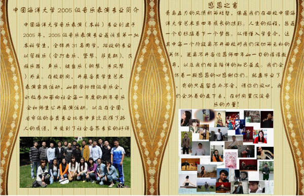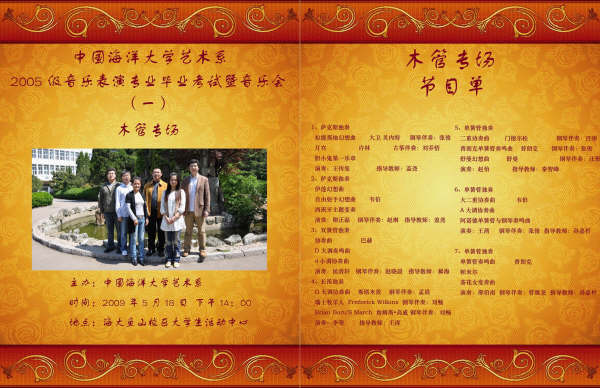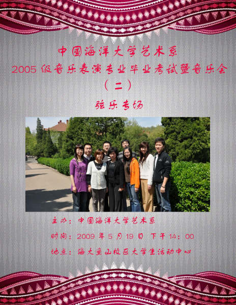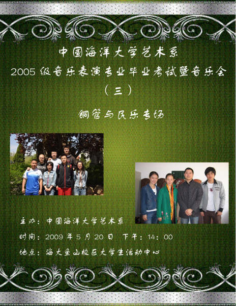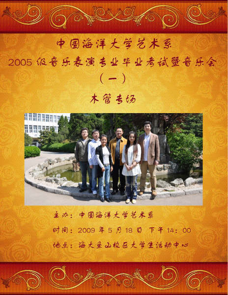 艺术系音乐表演专业2005级毕业系列音乐会将于2009年5月18日来开帷幕。此次系列音乐会将分为木管专场、弦乐专场、铜管民乐专场和键盘声乐专场四个部分以现场考试的形式进行。要求每位学生演奏达到毕业标准的规定曲目,是毕业考核的主体组成之一。