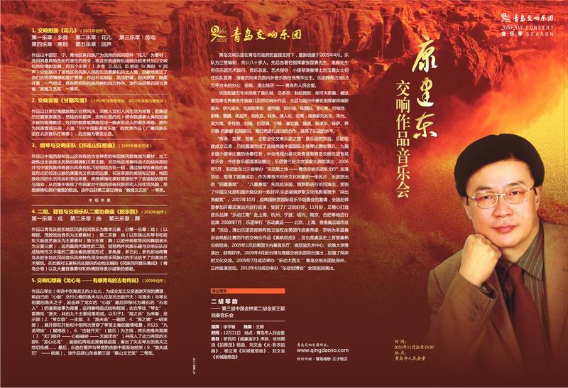 艺术系系主任、博士生导师、作曲家康建东教授“交响作品音乐会”将于2010年11月26日晚7时30分,在青岛人民会堂举行。