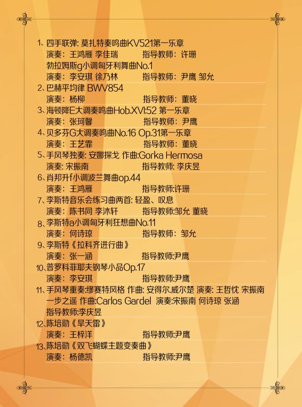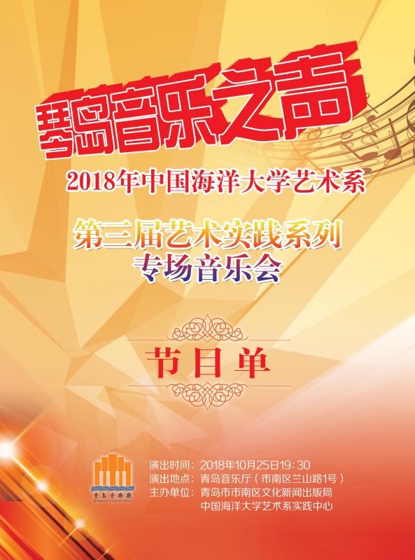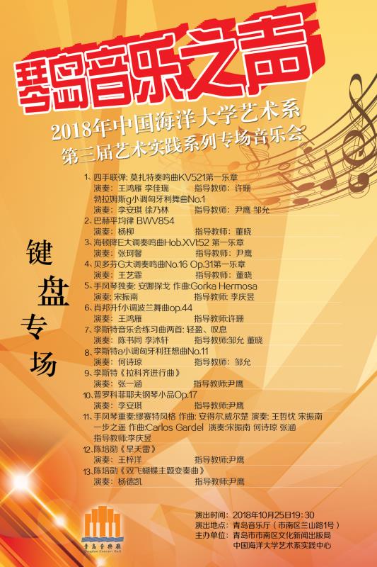 10月25日19时30分,“琴岛音乐之声”2018年开云电竞网址艺术系第三届艺术实践系列专场音乐会将在青岛音乐厅隆重举办。届时,一首首中外经典音乐作品将轮番奏响,艺术系键盘专业的优秀学生将共同围观中献上一场精彩纷呈的听觉盛宴。以下是本次音乐会的相关信息和节目预告,敬请期待!
