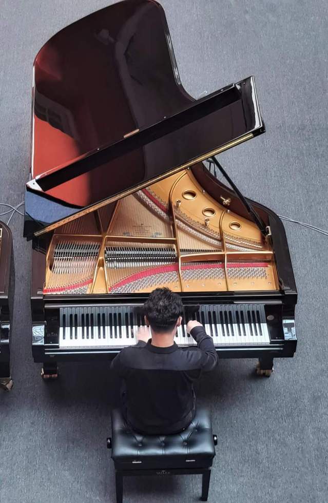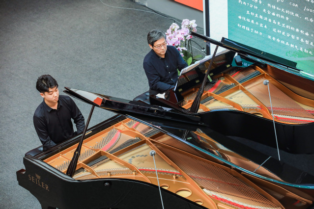 第一乐章,尹鹰教授奏出庄严的引子基本主题后,张一涵随即用密集洪亮的和弦伴随,宏伟有力。第一主题壮丽的生活颂歌,第二主题温暖而诚挚的抒情,一一呈现,令人陶醉。展开部节奏控制准确到位,高潮层出,让听众应接不暇。尤为印象深刻的是再现部的华彩乐段,张一涵得心应手,展现出娴熟的技巧和超强的即兴处理水平,将乐章中的意志力和激情淋漓尽致地表达出。精彩的发挥,使得现场听者获得了超预期的满足感。