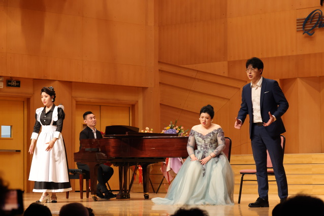 本场演出有一个不小的收获,是在听了周培沄演唱的咏叹调《女人善变》后。这位就读于海大艺术系音乐表演专业的小伙,甫一上台,就显示出强大的气场,上过魏松、莫华伦、石倚洁大师课的他,也颇具一些大师范儿。《女人善变》是男高音的试金石,挑战这个难度,周培沄显然是有备而来。在高音区突出的实力,使得他自信满满,演唱充满张力,他将曼图亚公爵浮华轻佻的内心世界,一一道出,表现可圈可点,对于他未来的发展心怀期待。美中不足,在对作品情感表达的细腻处理方面,他还尚欠火候。