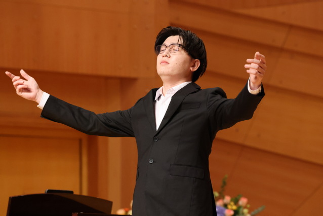 在热烈的掌声和期待中,孙道东副教授作为压轴,演唱了本场音乐会最后的一首独唱作品,歌剧《托斯卡》中咏叹调“奇妙的和谐”。钢琴前奏开始,孙教授已经充分地将情绪调动起来,当第一句歌词唱响,柔和的音色,立马将听众的情绪带入剧情。过程中,孙教授非常注重声音的舒展与弹性,气息把控稳定。随着音乐推进,声音也更加流动起来,悠扬婉转,典雅抒情……至曲尾,声音已逐渐广阔,最后走向壮阔,歌罢,现场听众们已然陶醉……孙教授声情并茂的演唱,展现出深厚的艺术功力与修养,给了学生们很好的示范与引领。