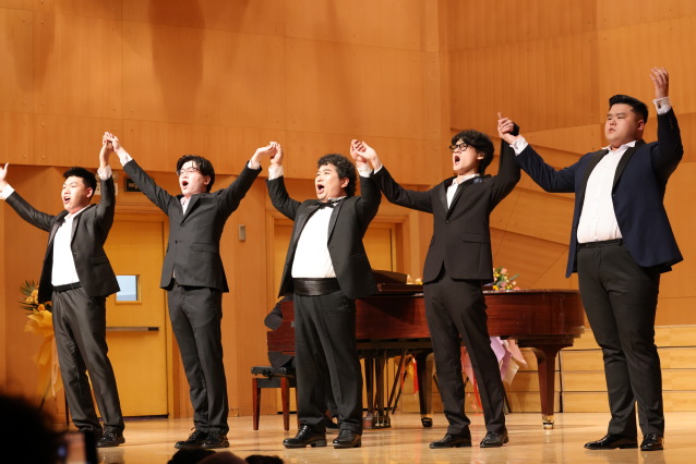 艺术系孙道东主任的再次登场,是携高子岫、李泽、周翰、周培沄四位弟子,共同演唱《今夜无人入睡》。咏叹调由老师高亢的开启,四位高徒互飙高音,各自特点鲜明。铿锵的力度,美感的声色,将音乐会掀起了一个新的高潮。