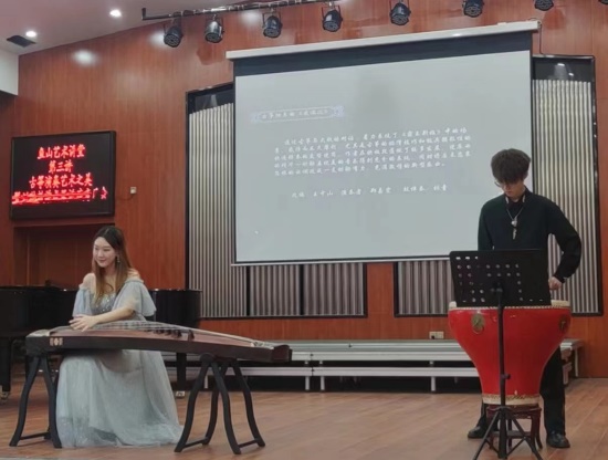 首先上场的郑嘉雯同学和张童同学为大家带来了古筝与鼓合奏的《夜深沉》。作为讲座音乐会的“开锣戏”,郑嘉雯同学的演奏带领观众迅速进入了《霸王别姬》的场景。