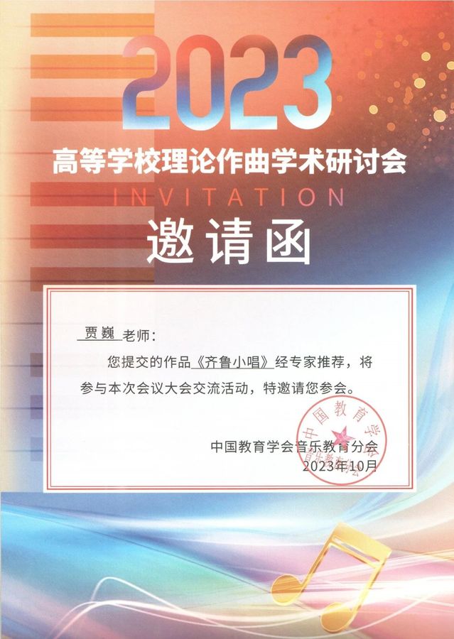 作为研讨会系列活动之一,2023年高校理论作曲学术研讨会部分征集作品音乐会,于10月21日晚在宁波音乐厅精彩上演。贾巍提交的作品《齐鲁小唱》与部分优秀作品在该音乐会上亮相。