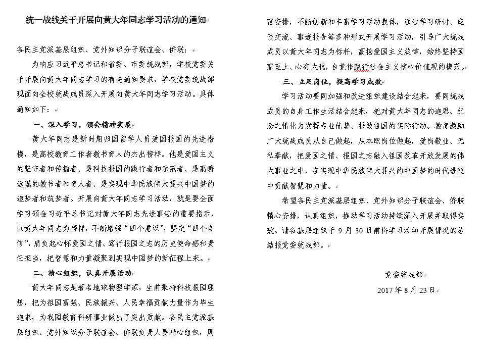 统一战线关于开展向黄大年同志学习活动的通知
