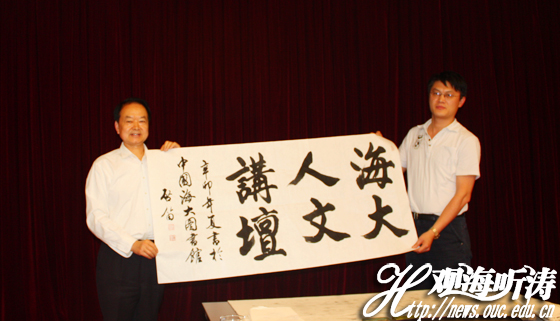 报告会后,启笛先生挥毫泼墨,现场为海大人文讲坛题字。海大党委宣传部、文科处、书法研究院、团委、研究生工作部等相关部门负责人及爱好书法的海大学子到场聆听启笛先生对书法的独特见解。
