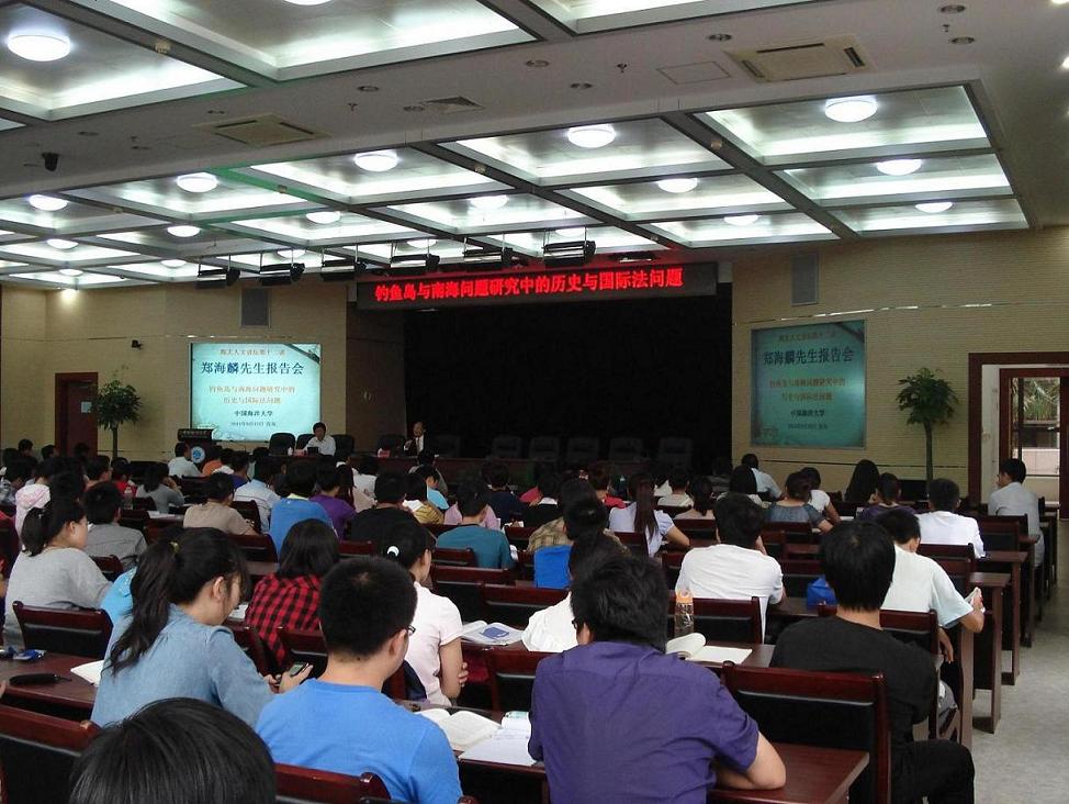 2011年9月13日下午,海大人文讲坛在图书馆第二会议室举行。香港中文大学亚太研究所研究员、教授郑海麟做题为“钓鱼岛与南海问题研究中的历史与国际法问题”的学术报告。文学与新闻传播学院党委书记陈�出席,林少华教授、郭培清教授、修斌教授、管一颖副教授、赵成国副教授等老师以及我校本科生、研究生约320人参加报告会。报告会有日本研究中心主任修斌主持。