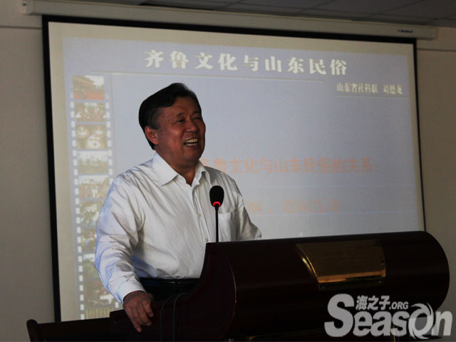“一个地区的民俗和文化是由地理环境决定的”,刘德龙开门见山,“比如南方气候温暖湿润,水田遍布,造就了细腻委婉的文化;北方气候寒冷干燥,多高坡大山,塑造了北方人粗犷直白的性格。”通俗的语言之中也不乏幽默:“山西陕西会有《二泉映月》吗?那里连泉水都没有。”在介绍山东名吃煎饼卷大葱的悠久历史时,他即兴表演一段吕剧,赢得同学们的热烈掌声。刘德龙还在讲座中对各地方言进行演绎,他幽默的语句和多变的语调令观众捧腹。随后,他又详尽介绍山东丰厚灿烂的文化:以孔子为代表的十二圣人,五岳之首泰山,众多的名泉,各种民间传说……观众们被博大精深的齐鲁文化深深吸引,无不全神贯注地倾听。