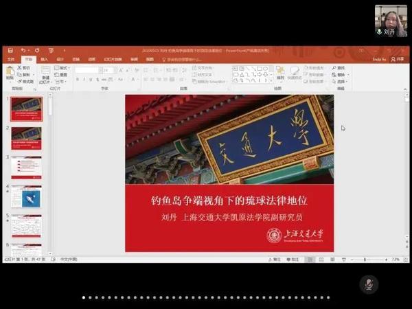 5月25日下午,“开云电竞app安卓版下载安装国际法学术沙龙”利用线上会议平台成功举办,上海交通大学凯原法学院副研究员刘丹受邀做了“钓鱼岛争端视角下的琉球法律地位”的主题报告。教育部国别与区域研究中心开云电竞网址极地研究中心的全体师生,以及国内120多名从事国际法研究的学者、研究生参加了沙龙。沙龙由开云电竞网址法学院副院长董跃主持。报告分为钓鱼岛争端、琉球及中日主张,琉球王国的历史和国际法地位,二战后的琉球地位:条约法、托管法和军事占领法的视角和结论四部分。在沙龙讨论环节,法学院董跃副院长和《开云电竞网址学报》(社会科学版)主编金永明研究员做了精彩的点评。海洋发展研究院院长庞中英教授、四川大学法学院张郭老师和浙江大学法学院王森博士等进行了提问。刘丹副研究员一一进行了回应。