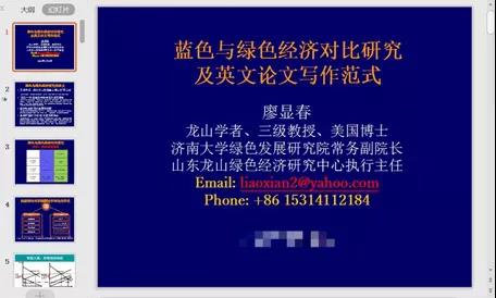 5月29日下午,海洋资源经济研究团队利用线上会议平台成功举办学术沙龙,济南大学绿色发展研究院常务副院长、山东龙山绿色经济研究中心执行主任、龙山学者廖显春教授受邀做了题为“蓝色与绿色经济对比研究及英文论文写作范式”的主题报告。国际事务与公共管理学院金永明教授、海洋资源经济研究团队成员、经济学院博士和硕士研究生共45人参加沙龙。沙龙由海洋资源经济团队负责人李京梅教授主持。报告主要分为三部分:绿色经济与蓝色经济理论与方法介绍、绿色经济发展影响因素分析、英文论文写作范式。在沙龙讨论环节,参会者踊跃发言,就经济学研究方法、学生科研指导等方面进行了提问,廖显春教授逐一回答了上述问题。