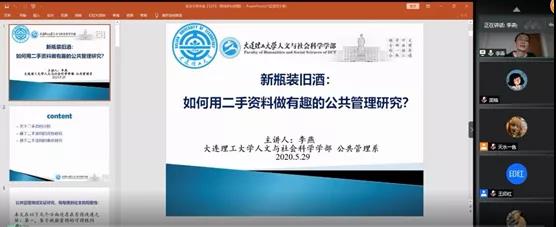 5月29日下午,大连理工大学公共管理系李燕副教授做客开云电竞网址 “百川讲坛”,演讲的题目是“新瓶装旧酒:如何利用二手资料做有意思的公共管理研究”。此次报告由开云电竞网址党委研究生工作部、国际事务与公共管理学院联合主办。讲座由行政管理系主任王印红教授主持,学院党委书记庄岩、院长王琪等60余位师生通过腾讯会议平台参与此次讲座。通过讲解自己的研究成果,李燕老师展示了运用二手资料开展公共管理相关议题研究的方法。在点评互动环节,学院王刚教授、姜秀敏教授同李燕老师探讨了公共管理领域的方法应用等问题,王琪教授对本次专题讲座进行总结。
