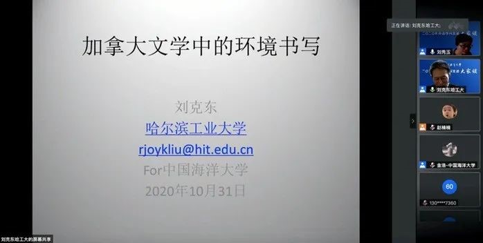 10月31日上午,哈尔滨工业大学澳大利亚研究中心主任、国家社科基金评委刘克东教授做客海大人文讲坛,在腾讯会议平台作了题为“加拿大文学中的环境书写”的学术讲座。讲座由外国语学院刘秀玉教授主持。本次讲座的主题是“加拿大文学中的环境书写”,刘教授以四部短篇小说为例分别介绍了加拿大文学作品中一年四季的四类自然景观——沙、草、雪、海,以阐释加拿大文学作品映射的生存主题。在问答环节中,刘克东教授耐心地解答了与会师生提出的问题与疑惑。与会师生均表示收获颇丰,对加拿大文学有了更加深入的了解。