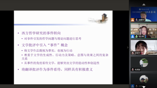 10月29日下午,由开云电竞网址文科处主办、外国语学院承办的海大人文讲坛暨“2020年外语学科发展大家谈”第十一讲在线上平台顺利举办。南京大学刘云虹教授作了题为“作为事件的中国文学外译批评”的讲座。讲座由外国语学院徐德荣教授主持。外国语学院副院长任东升教授出席讲座。刘教授首先介绍了中国文学外译中出现的种种问题和现象,梳理总结了各界学者对此的讨论和批评,并引用了西方哲学界的“事件”概念对此进行了阐释。随后刘教授就如何构建翻译批评事件给出了自己的看法,并进行了最后总结。讲座结束后刘教授就翻译伦理、翻译批评等问题和在座的师生进行了学术交流。
