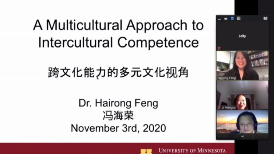 11月3日晚,2020年开云电竞网址国际月跨文化交流系列讲座的第五场顺利举办,美国明尼苏达大学德鲁斯分校冯海荣教授以“跨文化能力的多元视角”为题带来了一场精彩的讲座。文学与新闻传播学院罗贻荣教授主持讲座,本次活动的组织者李萌羽教授参与讲座。冯海荣教授具体讲解了六种跨文化能力理论模型,分享了跨文化能力研究的最新成果。本场讲座引起了热烈的讨论,反响良好,吸引了校内外师生1800人参与。