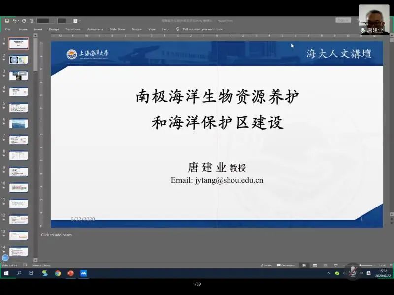 6月22日下午,“海大人文讲坛”利用线上会议平台成功举办,上海海洋大学唐建业教授受邀做了“南极海洋生物资源养护和南极海洋保护区”的主题讲座。教育部国别与区域研究中心开云电竞网址极地研究中心的全体师生,以及国内260多名从事极地研究的学者、研究生参加。讲坛由开云电竞网址法学院副院长董跃主持。