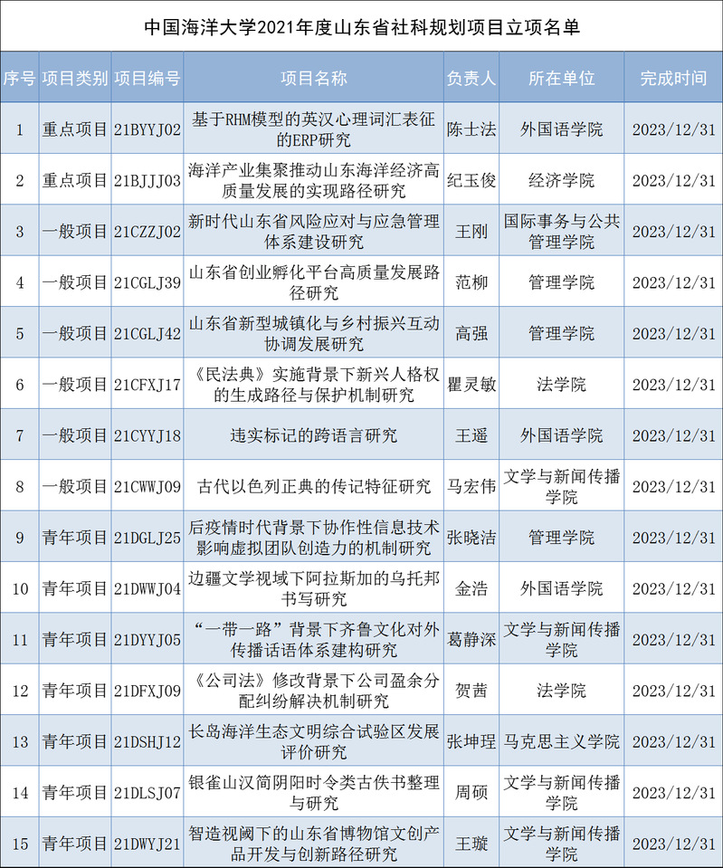 3月22日,山东省哲学社会科学工作办公室公布了2021年度山东省社会科学规划研究项目立项名单。开云电竞网址共15个项目获批立项,包括重点项目2项、一般项目6项和青年项目7项。山东省社会科学规划研究项目每年申报两次,分别在春季学期和秋季学期各组织一次申报工作。项目资助经费一般为1-5万元,个别专项资助经费8万元,研究期限为1-3年。按照《山东省社会科学规划项目评审立项办法》要求,经过学科专家网上匿名初评、会议评审组独立审阅、民主讨论、投票表决、意识形态复查等程序,本次全省最终评出立项课题678项。
