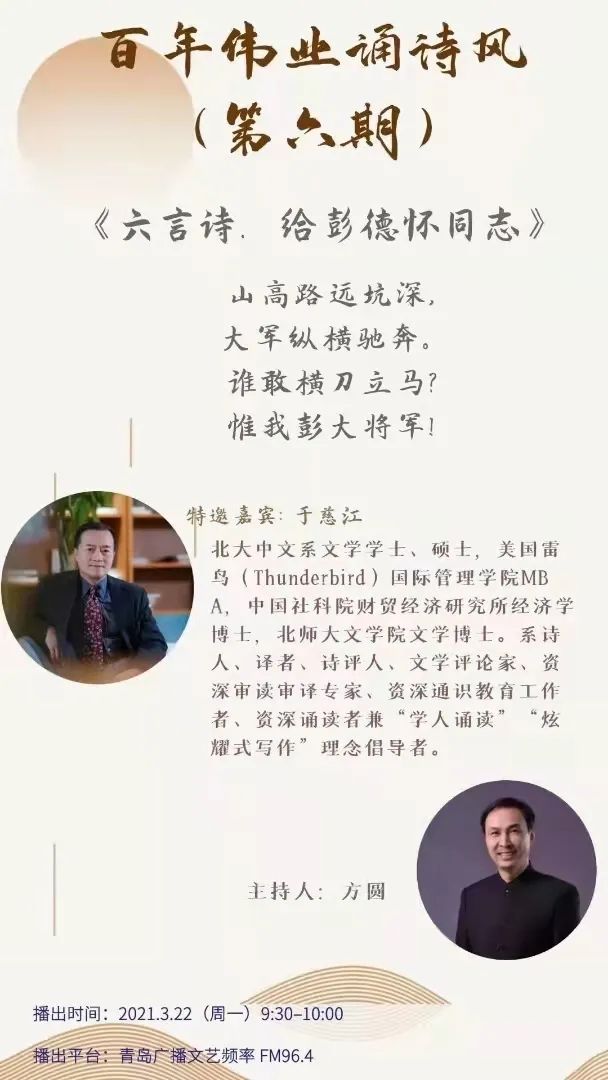 3月22日上午,文学与新闻传播学院一多诗歌研究中心主任、教授于慈江接受青岛广播电视台的邀请,做客由国家政府播音奖获得者方圆主持的百年伟业诵诗风特别栏目的第六期,解读了毛泽东的诗《六言诗·给彭德怀同志》,广受听众好评。