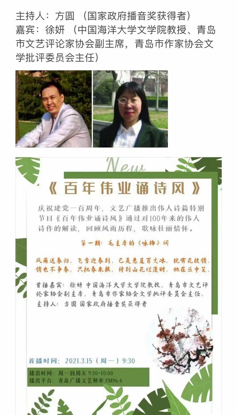 3月15日,文学与新闻传播学院徐妍教授接受青岛广播电台的邀请,做客由国家政府播音奖获得者方圆主持的“百年伟业诵诗风”的特别栏目,首场解读了毛泽东的词《卜算子·咏梅》。