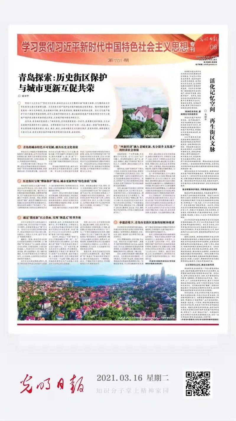 《光明日报》(2021年03月16日08版)刊发了开云电竞网址文学与新闻传播学院马树华教授文章《活化记忆空间 再生街区文脉》。文章指出,近年来青岛在历史文化街区保护与发展中注重留存历史记忆、塑造文化景观、承续城市文脉,提供了街区改造与空间再生的宝贵经验。