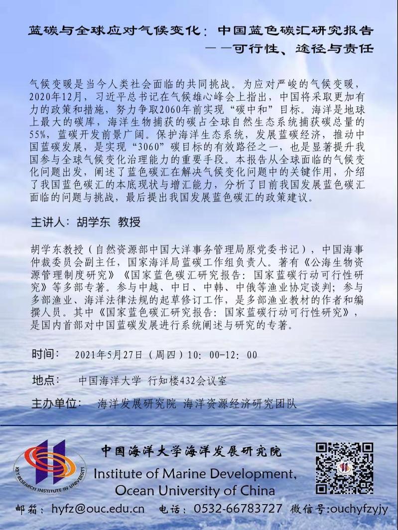 团队建设 | 学术活动预告:蓝碳与全球应对气候变化:中国蓝色碳汇研究报告——可行性、途径与责任