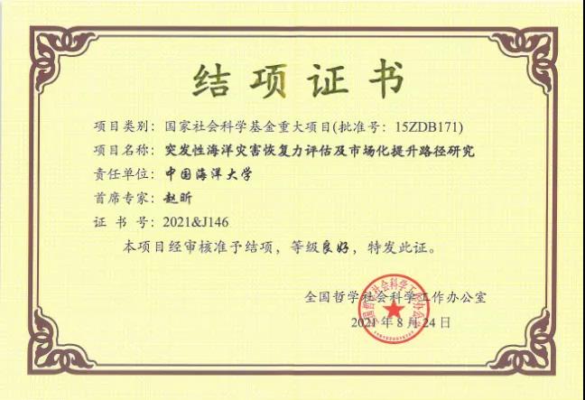 8月24日,山东省泰山学者特聘专家、经济学院院长赵昕教授主持的国家社科基金重大项目《突发性海洋灾害恢复力评估及市场化提升路径研究》顺利结项。该项目旨在以典型风暴潮灾害为切入点,基于突发性海洋灾害恢复力理论内涵界定及综合评估体系构建,搭建损失及脆弱性的动态监测体系,实现突发性海洋灾害恢复力综合评估,依托保险市场和债券市场,设计突发性海洋灾害恢复力提升路径。其系列研究成果为服务沿海地区社会经济持续、健康发展,助力国家“海洋强国”建设提供了理论支持和实施路径方案。