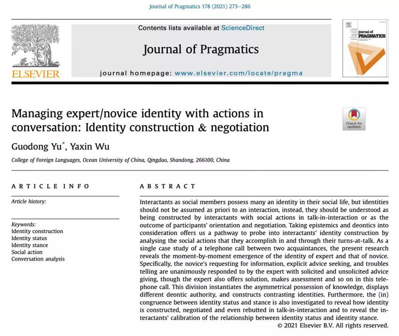 会话分析研究团队负责人于国栋教授和团队成员吴亚欣教授在语用学国际顶级期刊Journal of Pragmatics第178期上发表题为“Managing expert/novice identity with actions in conversation: identity construction & negotiation”的研究论文。