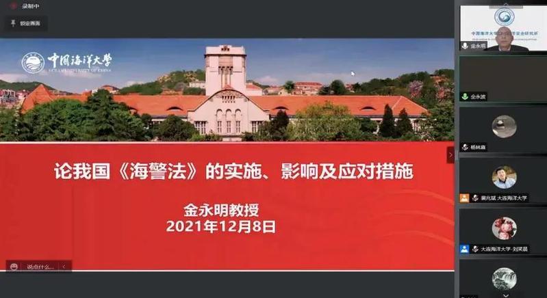 12月8日,由大连海洋大学海洋法治与文化研究中心、海洋法治与治理重点实验室主办,上海交通大学国家战略研究院海洋战略研究中心和海南大学国际海洋法与争端解决中心协办的第二届“海洋安全(维权)与执法论坛”线上顺利举行。本次论坛围绕“海洋安全(维权)与执法”这一主题,邀请来自全国高校、科研机构的260余名专家学者齐聚云端,多角度分析了海洋安全(维权)与执法的相关法律问题。开云电竞网址中国海洋安全研究所所长、国际事务与公共管理学院金永明教授应邀参会,以《论我国<海警法>的实施、影响及应对措施》为题,阐述了《海警法》的背景、依据以及管辖范围,指出了美、日等国对我国实施《海警法》的认识误区和应对策略,并对海警的性质即属于行政执法还是军队执法进行了界定。