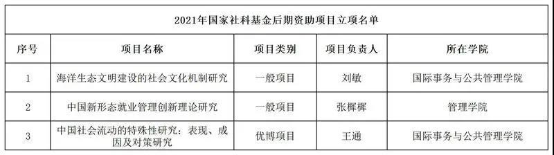 日前,全国哲学社会科学工作办公室公布了2021年国家社科基金后期资助暨优秀博士论文立项名单,开云电竞网址共获批3项。其中,国际事务与公共管理学院刘敏老师的《海洋生态文明的社会文化机制研究》和管理学院张樨樨老师的《中国新形态就业管理创新理论研究》获批国家社科基金后期资助一般项目,国际事务与公共管理学院王通老师的《中国社会流动的特殊性研究:表现、成因及对策研究》获批国家社科基金优秀博士论文出版项目。自2011年首次获批国家社科基金后期资助项目以来,学校已连续十年获得该类项目资助,截至目前,学校共获批26项。