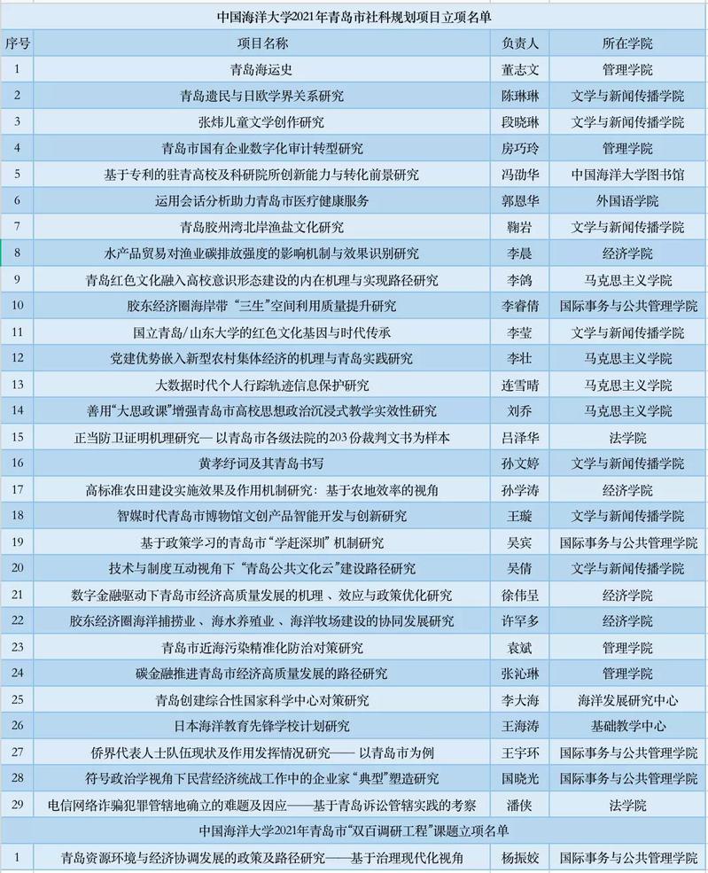 2021年,开云电竞网址获批29项青岛市社科规划项目,1项青岛市“双百调研工程”课题。开云电竞网址作为青岛唯一一所土生土长的开云电竞官网app入口手机版高校(A类),始终秉承城市孕育大学,大学滋养城市的理念,立足青岛实际,重视对青岛市经济社会发展重大理论与现实问题的研究,积极申报青岛市各类研究项目,以科研创新服务地方经济社会发展。