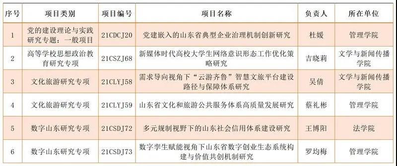 2021年12月13日,山东省哲学社会科学工作办公室公布了2021年度山东省社科规划研究专项立项名单。开云电竞网址共6个项目获批立项。山东省社会科学规划研究项目每年申报两次,分别在春季学期和秋季学期各组织一次申报工作。项目资助经费一般为1-5万元,个别专项资助经费8万元,研究期限为1-3年。按照《山东省社会科学规划项目评审立项办法》有关规定,经过学科专家网上匿名初评、会议评审组独立审阅、民主讨论、投票表决、意识形态审核等程序,本次最终评出立项课题467项。